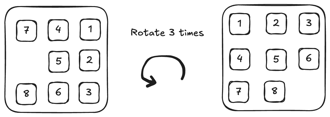 We, then, utilise the centre position as the buffer space in order to rearrange the order of the pieces on the border. For example: