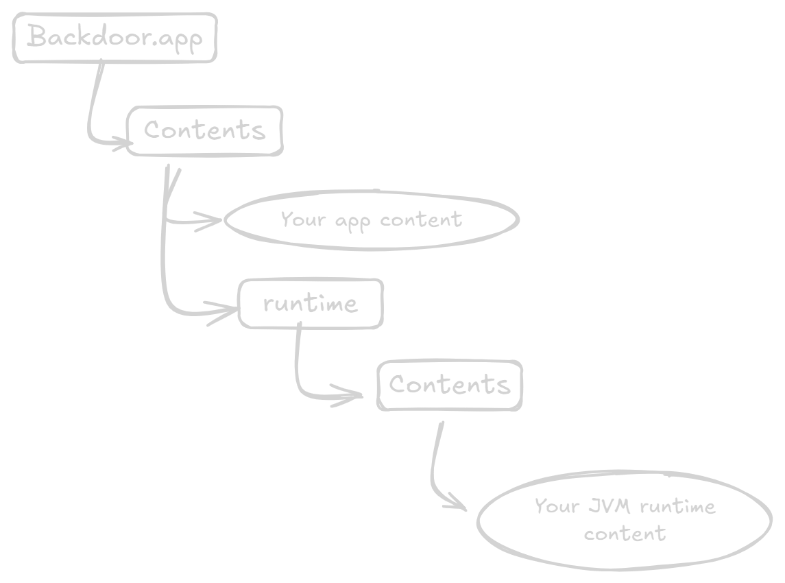 Backdoor.app. Your runtime executable is atBackdoor.app/Contents/runtime/Contents/Home/lib/jspawnhelper. These 2 must be codesigned with their corresponding entitlements.