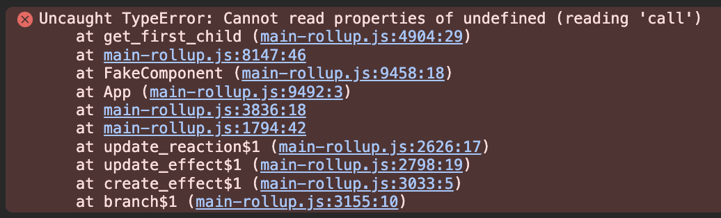 Cannot read properties of undefined (reading 'call')withinget_first_childorUncaught TypeError: Cannot read properties of null (reading 'f')onparent_effect.f