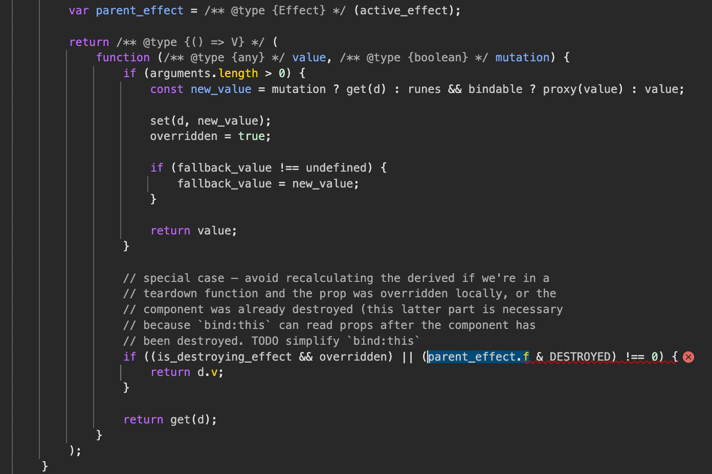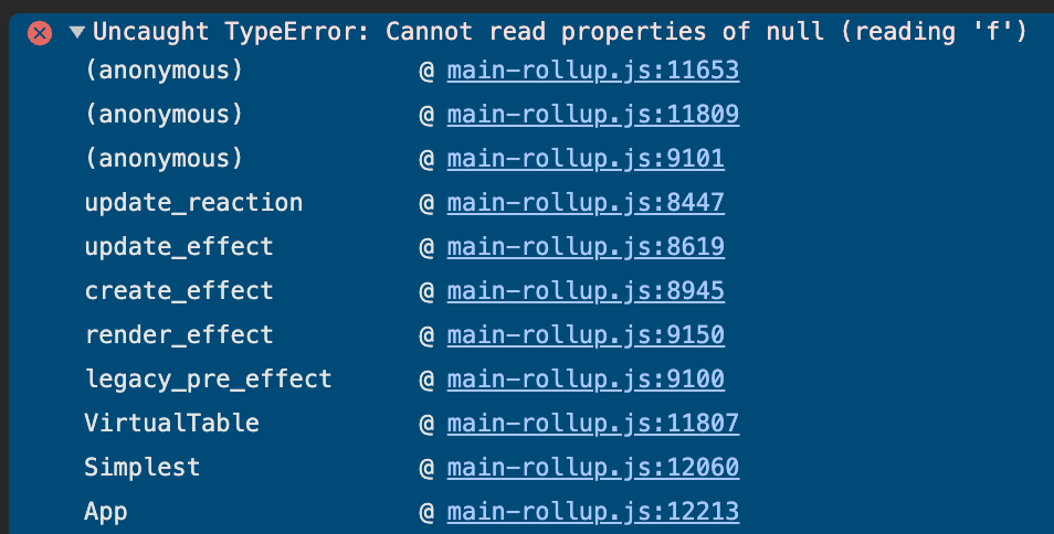 At some point, I also encountered this error: Uncaught TypeError: Cannot read properties of null (reading 'f') because parent_effect is null in the parent_effect.f statement.