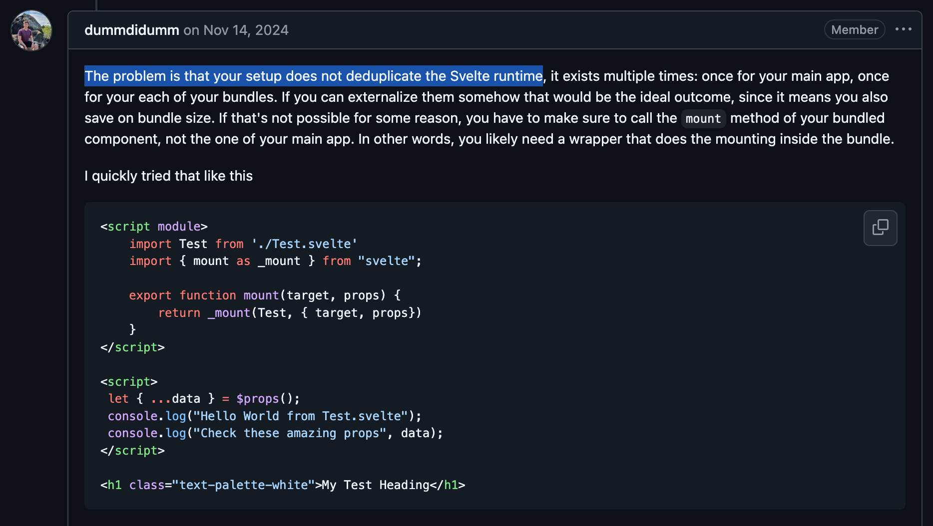 node_modulesfolder (orpackage.json; I didn't dive deeper) that belongs to the component folder's ancestor tree. If there are 2node_modulesfolders involved, then there will be duplicated Svelte runtimes. - Having duplicated Svelte runtimes would result in obscure errors like: